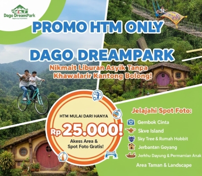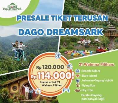 Presale Tiket Terusan 21 Wahana kini hanya 114 Ribu! (harga asli 120rb ditampilkan kecil di atasnya), memberikan Anda akses penuh ke wahana favorit Dago Dream Park seperti Sky Tree, Karpet Terbang, Flying Fox, Anti-Gravity, hingga arena bermain keluarga—semuanya dalam satu tiket super hemat. Dengan latar penuh warna dari berbagai wahana ikonik yang ada di Dago Dream Park, promo ini menghadirkan pengalaman lengkap untuk foto-foto, petualangan, dan liburan keluarga dengan harga terbaik.